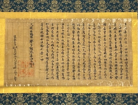 • 解説 掛軸 17行 興福寺印あり 「大般若波羅蜜多経巻第四百三十三」 木箱付き 虫損 発送方法:ゆうパック(国内送料無料)