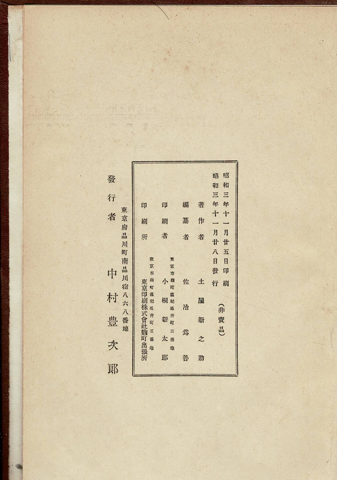 • 解説 大正3年発行(非売品)。裸本。ハードカバー裏表紙下部に表面の剥がれ(水濡れの影響か?)。扉に蔵書印。ところどころに鉛筆で印付け。赤ボールペンで1か所に書き込み。1葉に耳折。口絵ページ1葉の上部に接着跡。