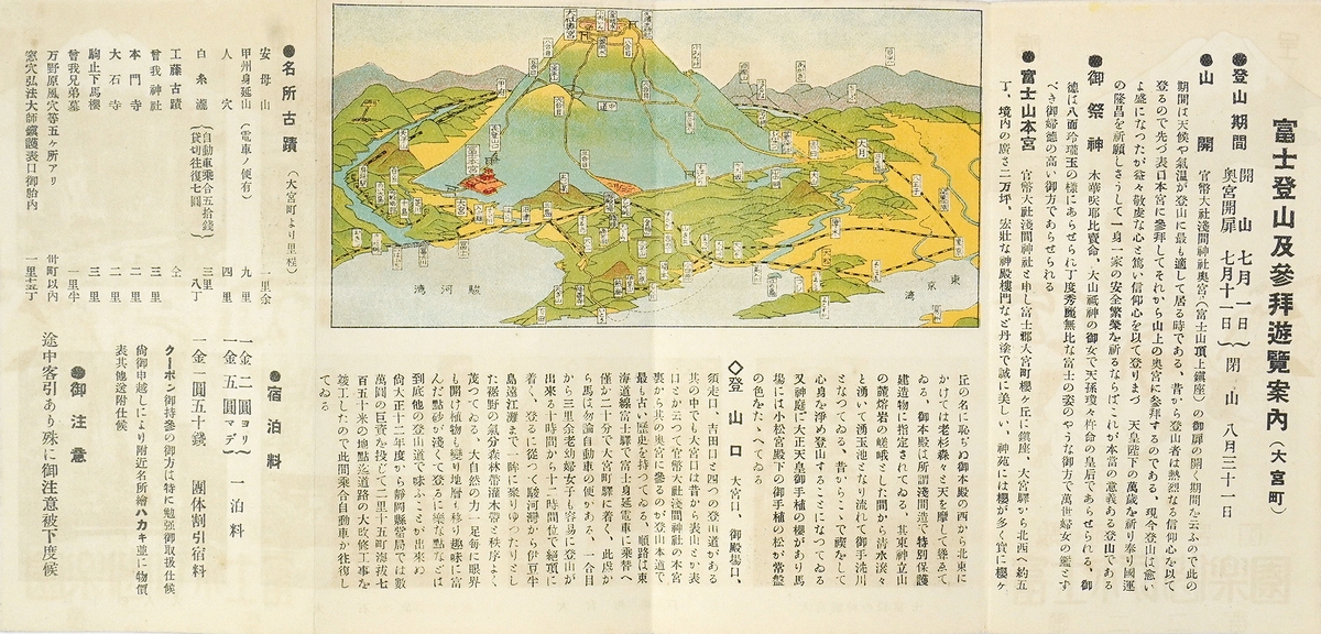 • 解説 両面印刷。鳥瞰図入。富士登山及参拝遊覧案内(大宮町)。