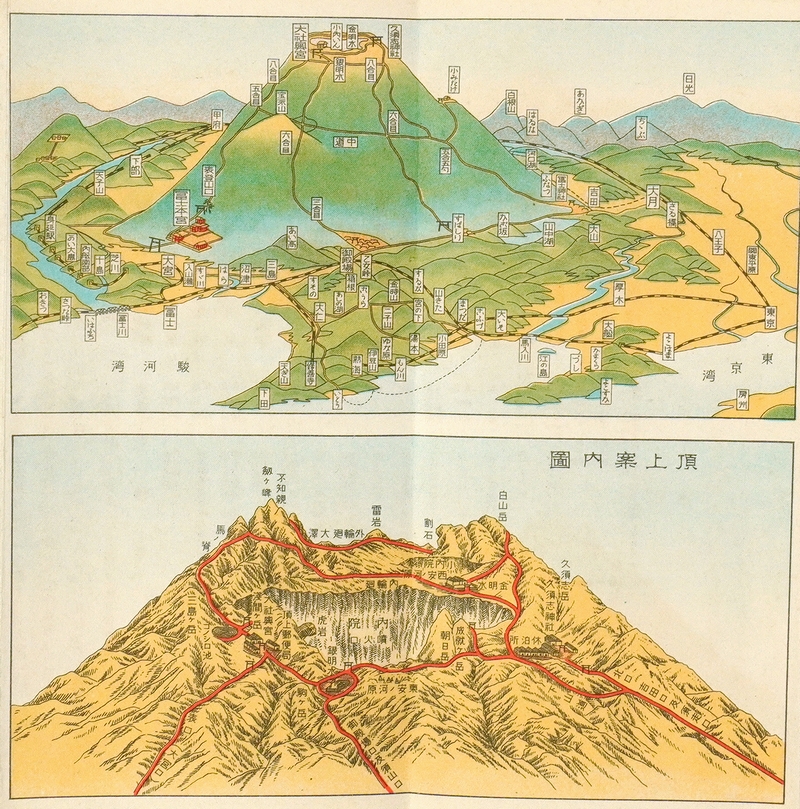 • 解説 富士登山便覧、鳥瞰図、頂上案内図、他。