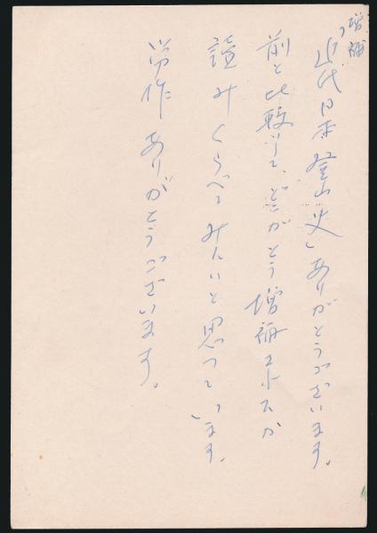 • 解説 昭和52年3月22日消印、ペン書き5行、内容は書籍のお礼です。