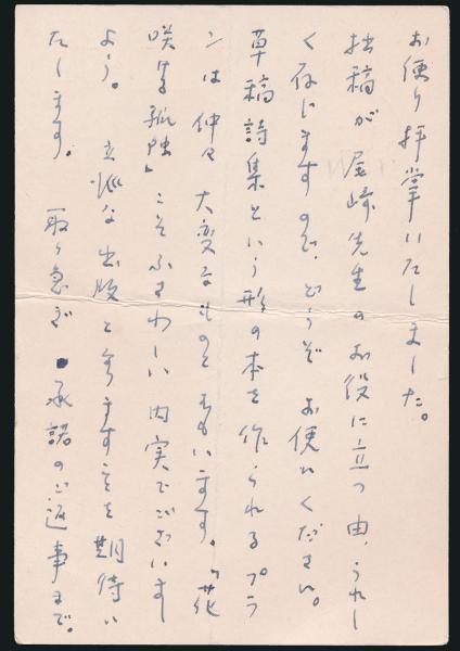 • 解説 昭和50年10月17日消印、ペン書8行、四つ折りの跡がございます。内容は原稿使用承諾の連絡です。