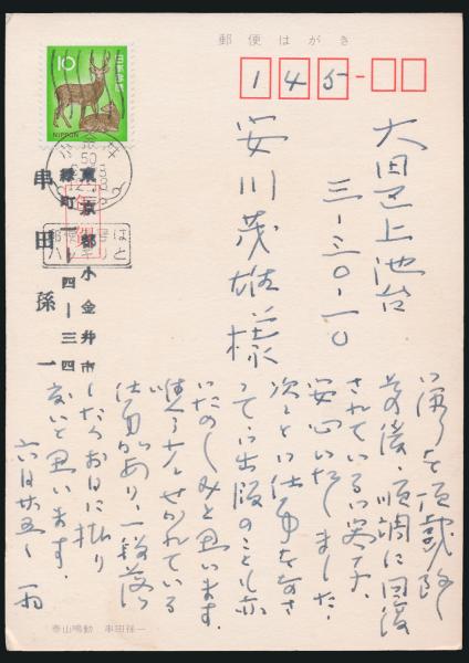串田孫一葉書 安川茂雄宛