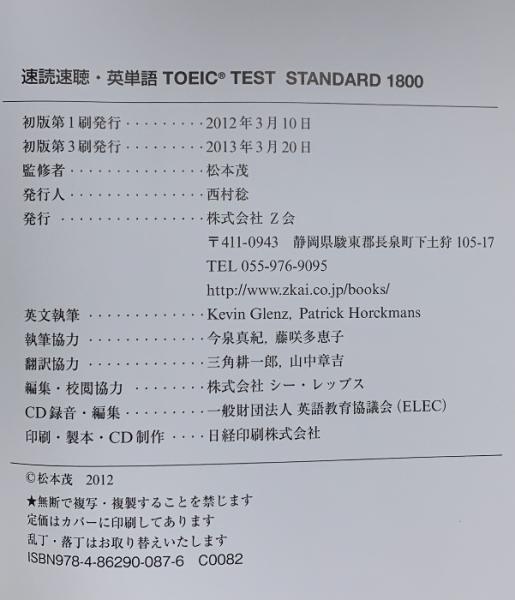 速読速聴・英単語 TOEIC TEST STANDARD 1800 Z会 Patrick Horckmans