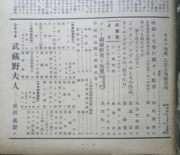 映画と文学に関する断章/津村秀夫 学ぶべき点はあるが驚くほどのことはない/大谷竹次郎 ジャク・プレヴェルとその作品/飯島正 カール・ドライエルの「怒りの日」/岡俊雄 コニー劇場経営と施策/鳥羽和一 シナリオ・武蔵野夫人/依田義賢 他