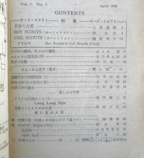 特集/ボーイスカウト・ガールスカウト 世界の友愛/三島通陽 Boy Scouts Girl Scoutsの生活 内がわの意味、外がわの意味/佐々木達 カム・カムの英文法(3)/松川昇太郎 発音の征服/平川唯一 カム・カム坊や/横山隆一 アメリカ民謡めぐり(3)/堀内敬三 他