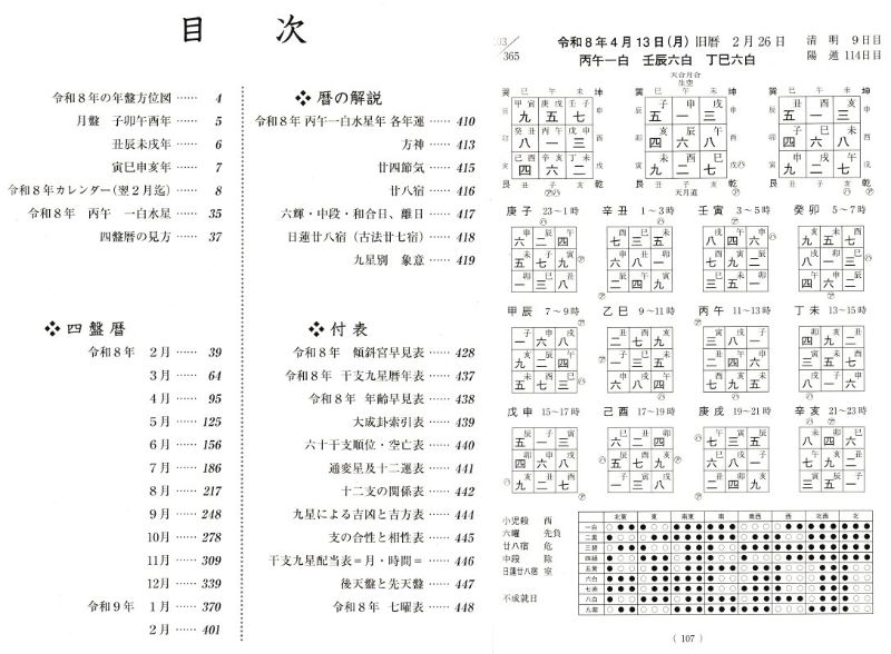 【目 次】●令和8年の年盤方位図 ●月盤 子卯午酉年 ・丑辰未戌年・寅巳申亥年 ●8年カレンダー(翌2月迄)●令和8年丙午 一白水星 ●四盤暦の見方●四盤暦 ★暦の解説 ●令和8年 丙午一白水星年各年運 ●方神 ●廿四節気 ●廿八宿 ●六輝・中段・和合日、離日● 日蓮廿八宿(古法廿七宿) ●九星別象意 ★令和8年 傾斜宮早見表 ●令和8年 干支九星曆年表 ●令和8年 年齢早見表 ●大成卦索引表 ●六十干支順位・空亡表 ●通変星及十二運表 ●十二支の関係表 ●九星による吉凶と吉方表 ●支の合性と相性表 ●干支九星配当表月・時間 446 ●後天盤と先天盤●令和8年七曜表