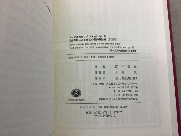 【除籍本】復刻版 日本立法資料全集 別巻243 ローマ法及びフランス法における代金不払による売主の契約解除権(仏語版)