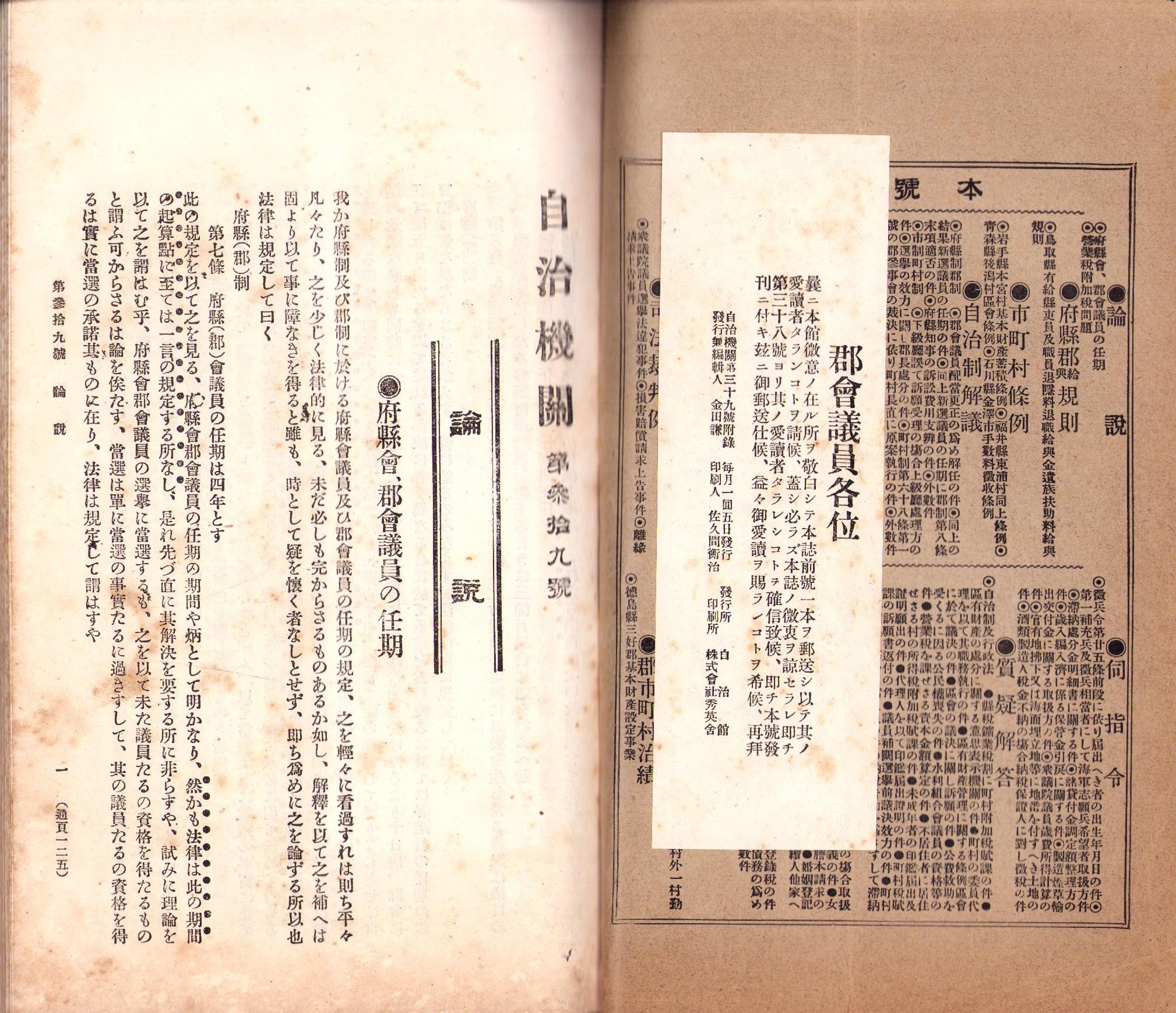 • 解説 A5判、72頁、表紙裏に附録貼付(小紙片「郡会議員各位」)、中央折れ、裏表紙に切手はがし跡