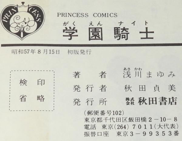 • 解説 浅川まゆみ 学園騎士 秋田書店プリンセスコミックス 昭和57年8月初版 新書判.
