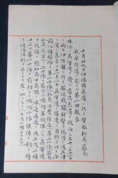 • 解説 海軍用箋 16丁 写本 常備艦隊司令長官柴山矢八 10月29日伊豫国長濱ニ於テ軍艦松島・厳島・扶桑損傷ニ関スル報告書
