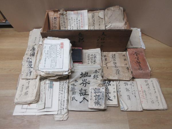 • 解説 後藤田増三郎関係多し(後藤田正晴の父) 土地台帳、土地所有者名寄帳、地券証、借用証書、地引絵図、裁判資料、税金関係、諸願伺届証書、海中日記他大きな木箱1箱分