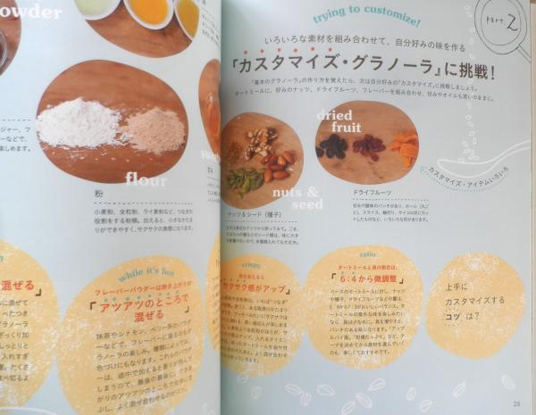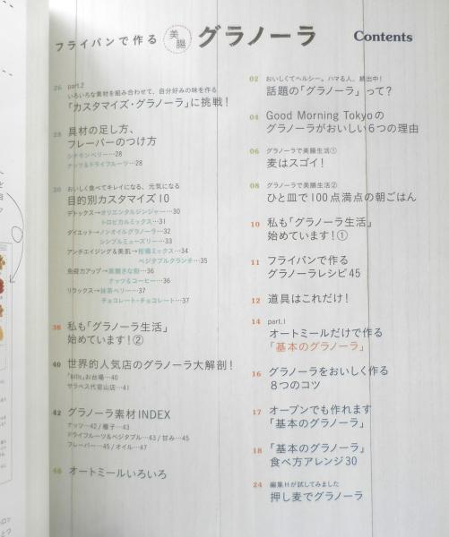 ひと皿で100点満点の朝ごはん フライパンで作るグラノーラレシピ45 オートミールだけで作る「基本のグラノーラ」 「基本のグラノーラ」食べ方アレンジ30 押し麦でグラノーラ 「カスタマイズ・グラノーラ」に挑戦! 具材の足し方、フレーバーのつけ方 目的別カスタマイズ10 グラノーラ素材INDEX 他