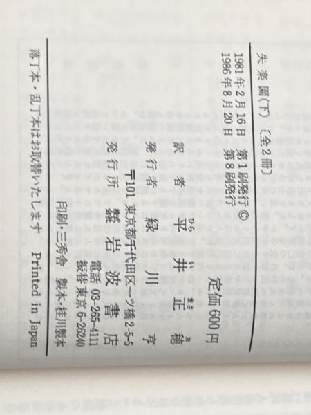 失楽園 下 (岩波文庫 赤 206-3) 岩波書店 ジョン・ミルトン