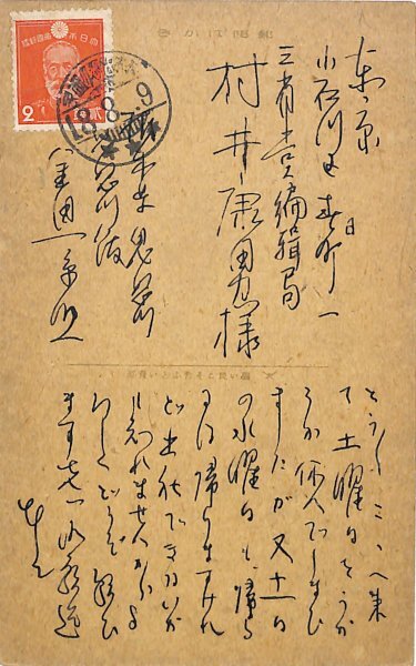 • 解説 村井康男宛 ペン書 11行 昭18・8・9(消印) 絵葉書 「鬼怒川大瀞の楽しき舟遊び」絵葉書使用。「十一日の水曜日も、帰るには帰りますけれど出社できないかも知れませんからよろしくどうぞ願ひます」。(発信地)鬼怒川宿(受信地)三省堂編輯局 #八木書店近代自筆物/3.葉書類 #八木古書2026年4月新蒐 95712350 ※自筆物につきましては、毎月25日前後に新蒐品を追加しております。PDF形式で御覧になりたい方は https://company.books-yagi.co.jp/archives/news/10928 を参照ください。95号目録(R8.1)以後の追加は「#八木古書2026」で検索できます。