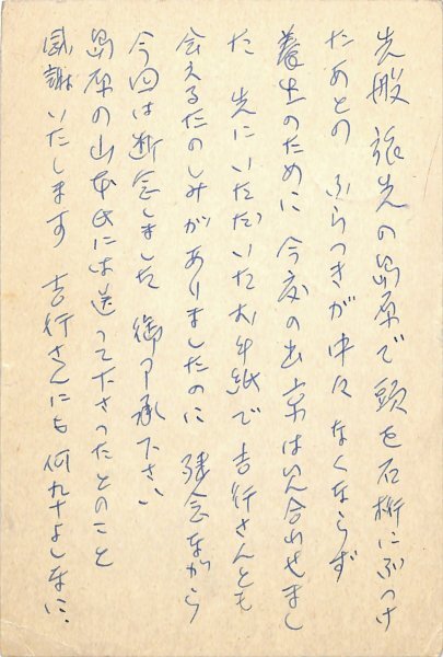 • 解説 玉井五一宛 ペン書 8行 昭50・11・17(消印) 速達 出京の中止。「旅先の島原で頭を石桁にぶつけたあとのふらつきが中々なくならず養生のために今度の出京は見合わせました」。(発信地)指宿市西方(受信地)創樹社 #八木書店近代自筆物/3.葉書類 #八木古書2026年4月新蒐 95113400 ※自筆物につきましては、毎月25日前後に新蒐品を追加しております。PDF形式で御覧になりたい方は https://company.books-yagi.co.jp/archives/news/10928 を参照ください。95号目録(R8.1)以後の追加は「#八木古書2026」で検索できます。