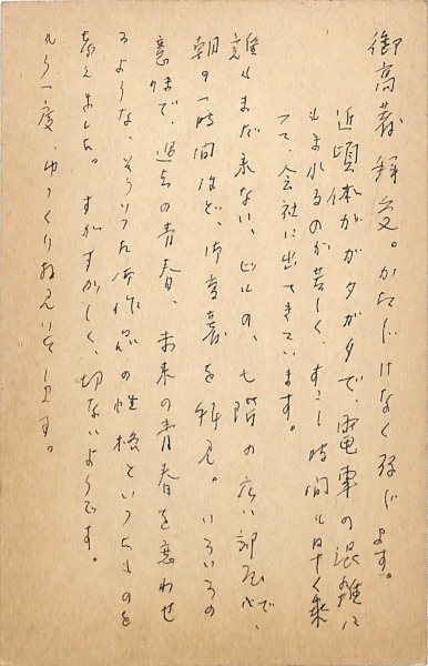 • 解説 東博宛 ペン書 10行 昭35・1・25(消印) 住所氏名印刷 献本礼状。「いろいろの意味で、過去の青春、未来の青春を恋わせるような、そういつた御作品の性格といつたものを考えました」。(発信地)三鷹市牟礼(受信地)筑摩書房 #八木書店近代自筆物/3.葉書類 #八木古書2026年4月新蒐 95013500 ※自筆物につきましては、毎月25日前後に新蒐品を追加しております。PDF形式で御覧になりたい方は https://company.books-yagi.co.jp/archives/news/10928 を参照ください。95号目録(R8.1)以後の追加は「#八木古書2026」で検索できます。