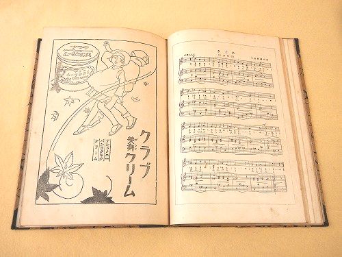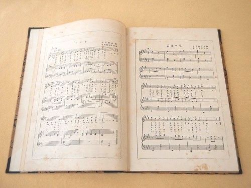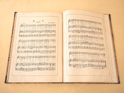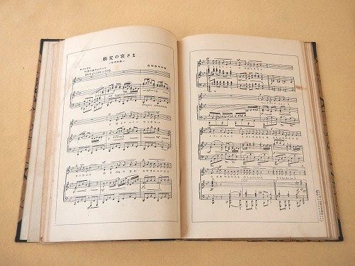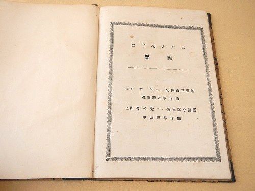 • 解説 コドモノクニの楽譜部分を綴じて合本にしたもの。約26×18センチ。100ページほど。北原白秋、中山晋平、浜田広介、野口雨情、山田耕筰、など。全体に経年よごれ。