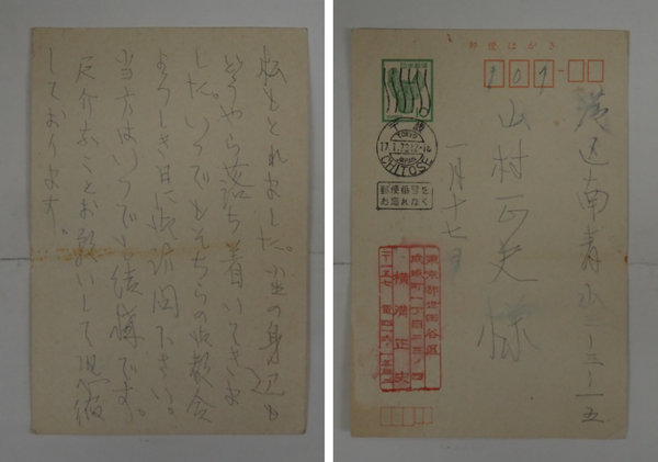 横溝正史葉書 山村正夫宛ペン書7行 署名はスタンプ