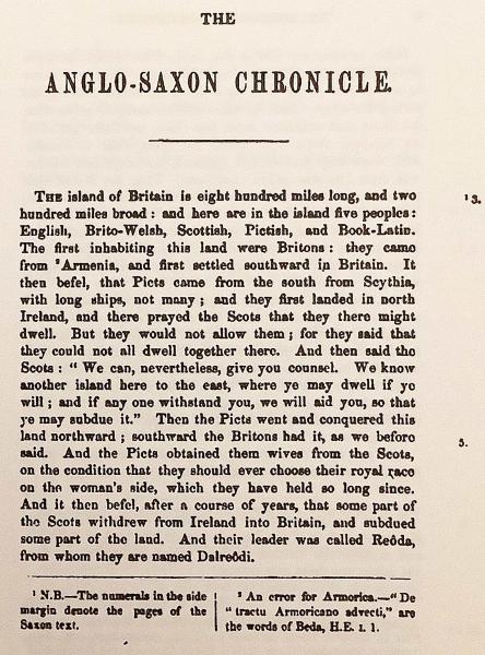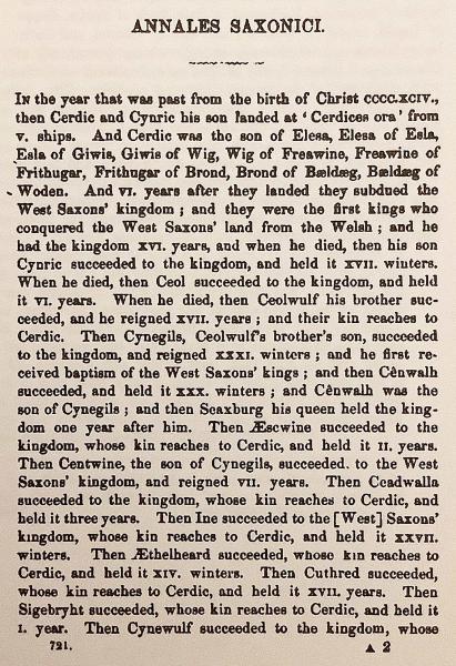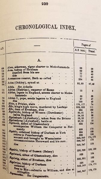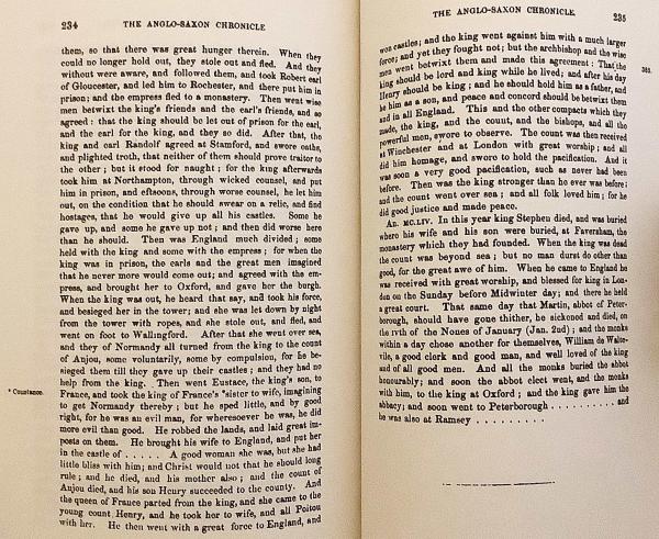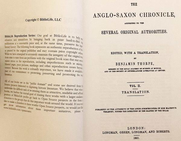 9世紀から12世紀にかけて編まれたイングランド史最古の年代記『アングロ=サクソン年代記』 (1848年版、Benjamin Thorpe 編) を底本とし、複数写本 (ウィンチェスター本、ピーターバラ本など) を比較した校訂版。