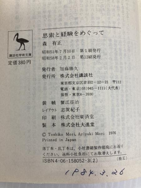 思索と経験をめぐって (講談社学術文庫 52) 講談社 森 有正
