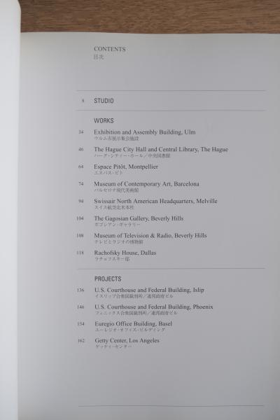 ウルム市展示集会施設、ハーグ・シティー・ホール、バルセロナ現代美術館、スイス航空北米本社、ガゴシアン・ギャラリー、ゲッティ・センターなどの作品・プロジェクトを収録。ソフトカバー。