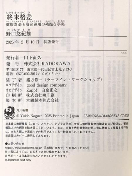 終末格差 健康寿命と資産運用の残酷な事実 (角川新書) KADOKAWA 野口 悠紀雄