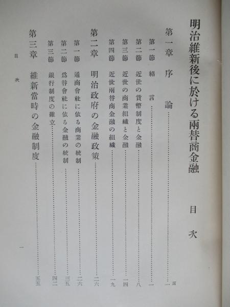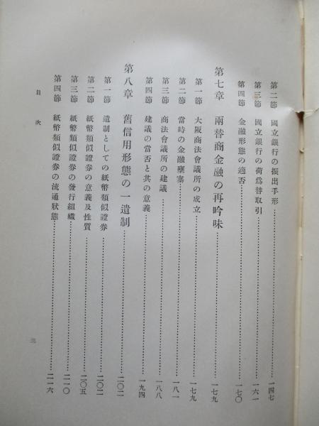 第一章 序論、第二章 明治政府の金融政策、第三章 維新當時の金融制度、第四章 銀目廢止と其の影響、第五章 新手形の制定と普及、第六章 國立銀行の金融形態、第七章 兩替商金融の再吟味、第八章 舊信用形態の一遺制、第九章 餘論、附録:兩換營業規則草案。