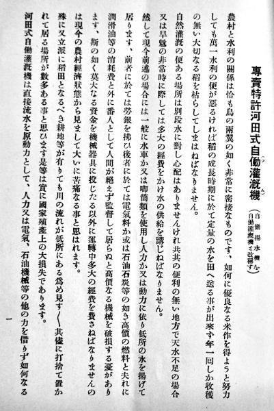専売特許河田式自働灌漑機(自働揚水機改称) A5判12p(1p鉛筆書込有り) 東京アイヱス商会 大正14年
