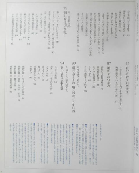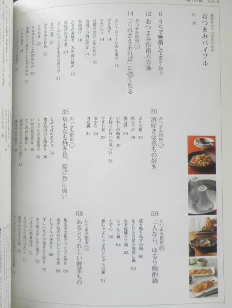 酒好きのココロをつかむおつまみバイブル うちで晩酌してますか? おつまみ指南六カ条 「これさえあれば」に強くなる 酒好きは煮もの好き 男も女も焼き色、揚げ色に弱い 二人なら、ゆるり晩酌 あるとうれしい野菜もの 刺し身は切り札! 自分に合うお酒選び 酒粕でおつまみ 蔵元おすすめ・地元の肴とうまい酒 あっさりご飯と麺 他