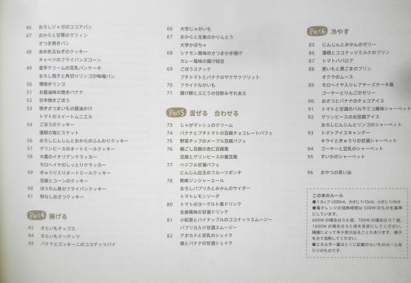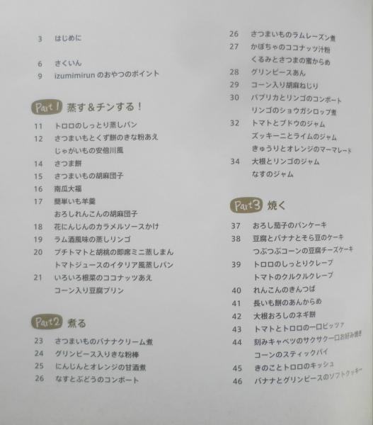Part1/蒸す&チンする! Part2/煮る Part3/焼く Part4/揚げる Part5/混ぜる・合わせる Part6/冷やす 枝豆/大葉/オクラ/かぼちゃ/きのこ/キャベツ/きゅうり/グリンピース/ゴーヤー/ごぼう/小松菜/さつまいも/里いも/じゃがいも/しょうが/ズッキーニ/そら豆/大根/玉ねぎ/とうもろこし/トマト/長いも/長ねぎ/なす/にんじん/パプリカ/ほうれん草/モロヘイヤ/れんこん/ごま
