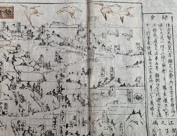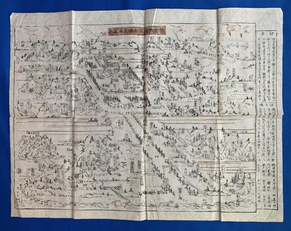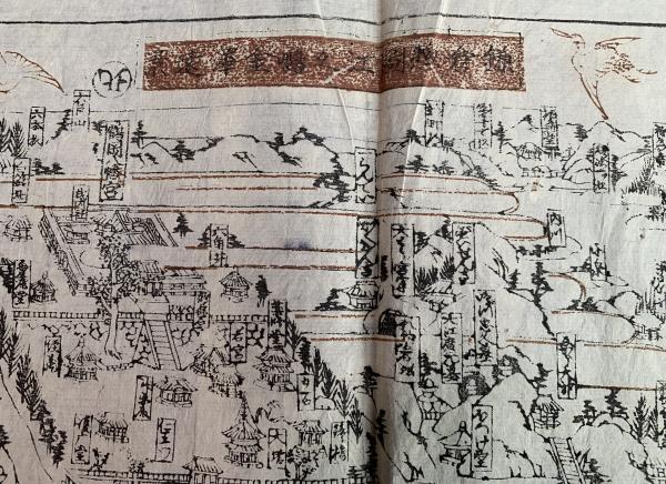 ▶ 鶴岡八幡宮を中央に据え、東西南北に、社寺を配置、左下に江之嶋、その右横に富士、対岸に龍口寺、極楽寺を抜け長谷観音、高徳院の大仏、いなせ川に沿い由比ヶ浜、ゑんま川(現在の滑川・なめり川)を超えて、右下の光明寺、画面左上、北に円覚寺、明月院、建長寺、右なか東に向い、ほっけ堂、明王院、その上、右上に、金澤の遠景が望まれます。
