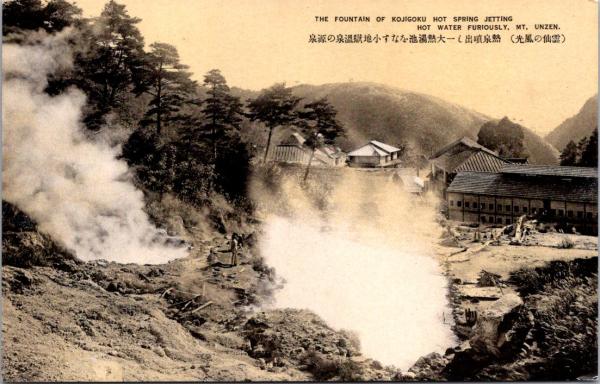 1001382■戦前 絵葉書■雲仙の風景 熱泉噴出し一大熱湯池をなす小地獄泉の源泉(建物 旅館)