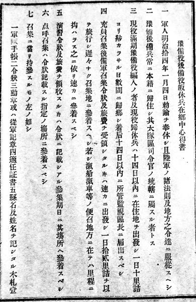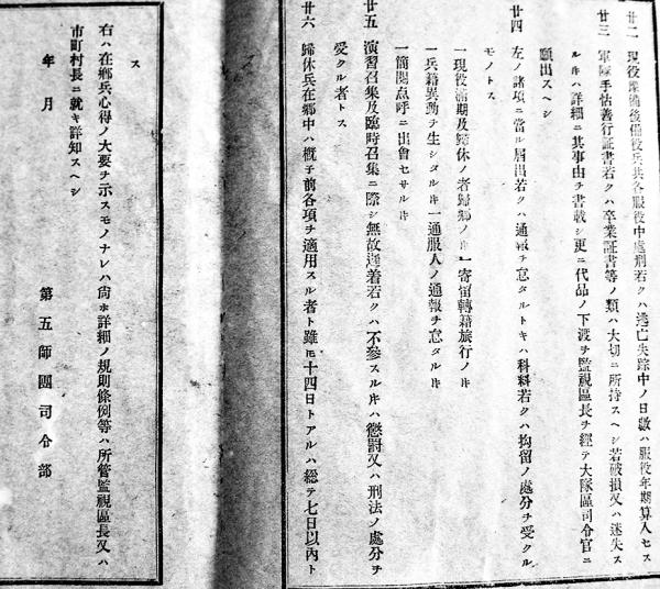 予備役後備役皈休兵在郷中心得書 B6判7p 第五師団司令部 明治刊
