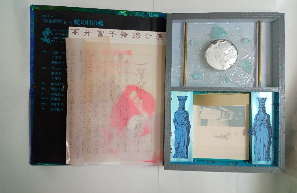 • 解説 1986年2月、草月ホールで開催された同公演にあわせて作られたオブジェ本(函)。34×25㎝。青のコーティング木枠の函に金属製コンパクト填め込み(蓋をとると中に高井の写真貼り込み)、周囲に透明の石と水を模したものを配置。未綴じのテキスト(土方巽、高井富子、加藤郁乎。全23葉=内3葉は白紙)。加藤郁乎の自筆原稿複製、入場券、案内チラシ入。函に紐穴があるが紐はない。保存良好。
