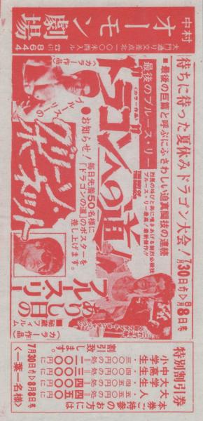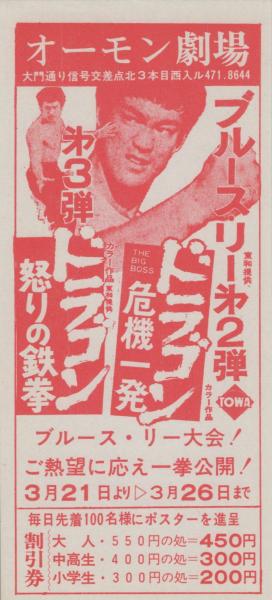 1001◆映画 割引券▲ ブルース・リー ドラゴン危機一発 ドラゴン怒りの鉄拳 中村 オーモン劇場 (愛知県・中村区大門)
