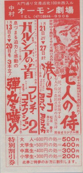 1003▲映画割引券▲ 七人の侍 黒沢明 監督 港のヨーコ ガルシアの首 弾丸を噛め フレンチ・コネクション2 オーモン劇場(中村区大門)