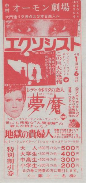 1005◆映画 割引券▲ エクソシスト 夢魔 地獄の貴婦人 レディ・イポリタの恋人 中村 オーモン劇場 (愛知県・中村区大門)