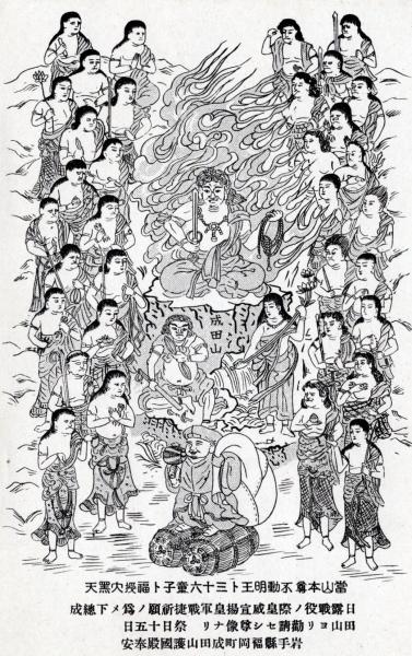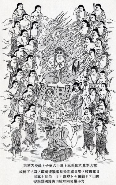 N26022113○戦前絵葉書○岩手県福岡町(現在の二戸市)の名所 成田山護国殿 日露戦争 成田山より勧請 不動明王と36王子絵図 不動尊御詠歌○和本古書古文書