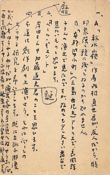 丸岡明葉書 文学座編集室宛 アンケート回答 色鉛筆書9行