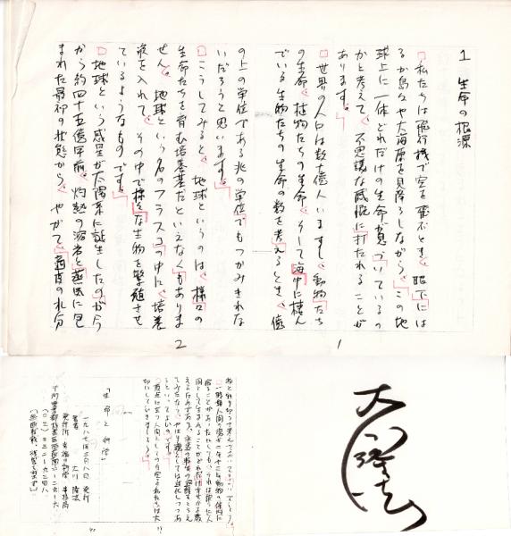 6) 大川隆法『生命と科学』(1987)原稿コピー20枚と直筆署名(台紙約13×9㎝)