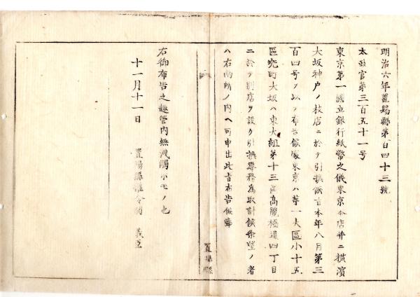 N26012111○明治布告布達○東京第一国立銀行 紙幣引換の為東京兜町、大坂高麗橋通四丁目に別店を設置 〇明治6年 太政官布告 置賜県○和本古書古文書
