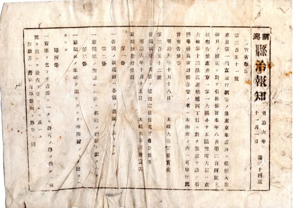 N26012124○明治布告布達 新潟県治報知 明治6年11月1日第34号〇太政官布告・第一国立銀行東京大阪に引替専門店設置・新聞紙発行条例18カ条・横浜為替会社発行金券引換方○和本古書古文書