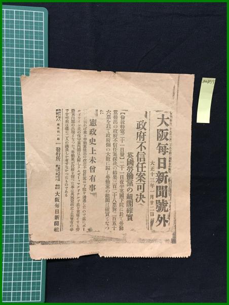 【大阪毎日新聞 大正13年1月22日 号外】【政府不信任案可決 英国労働党の組閣確実 憲政史上未曽有有事】
