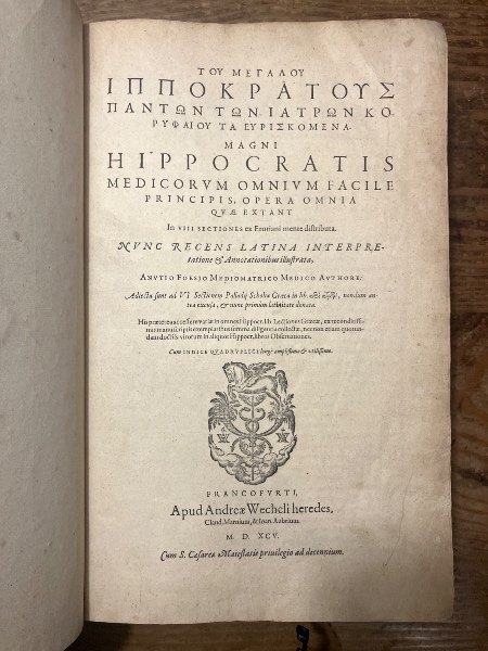 (希羅)[ヒポクラテス全集] 医学全能の偉大なヒポクラテス〜 8 つのセクションに分けられたすべての作品集 フランクフルト、ヴェヒェリ、1595年刊行 Magni Hippocratis medicorvm omnivm facile principis, Opera omnia quae extant in VIII sectiones ex Erotiani mente distributa: in VIII sectiones ex Erotiani mente distributa