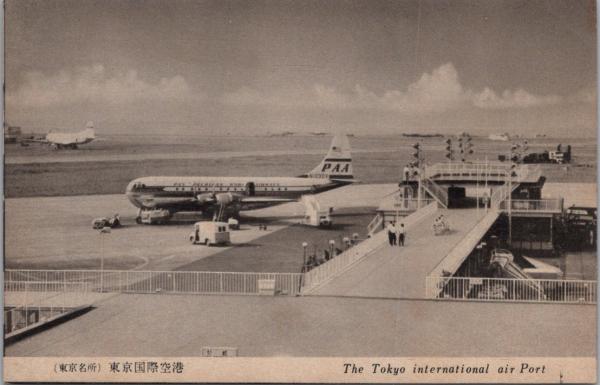 1000973■戦前 絵葉書■東京名所 東京国際空港 写真版 旅客機 PAA パンアメリカン航空機 パンナム機 羽田空港 飛行機 東京名所 東京都AA