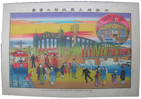 東京名所(大判)両国橋之光景 彩色砂目石版画 浦島堂 大正7年