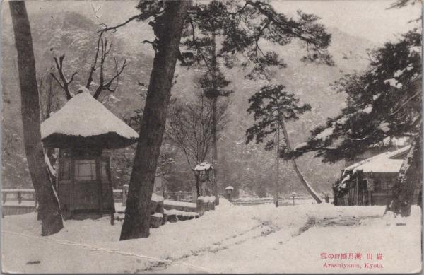 1000379■戦前 絵葉書■京都 嵐山 渡月橋岬の雪 ピン穴