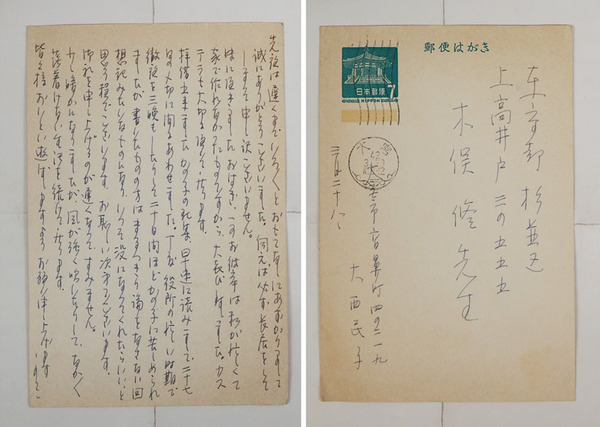大西民子葉書 木俣修宛 ペン書13行 「…別居して十年になったので…」