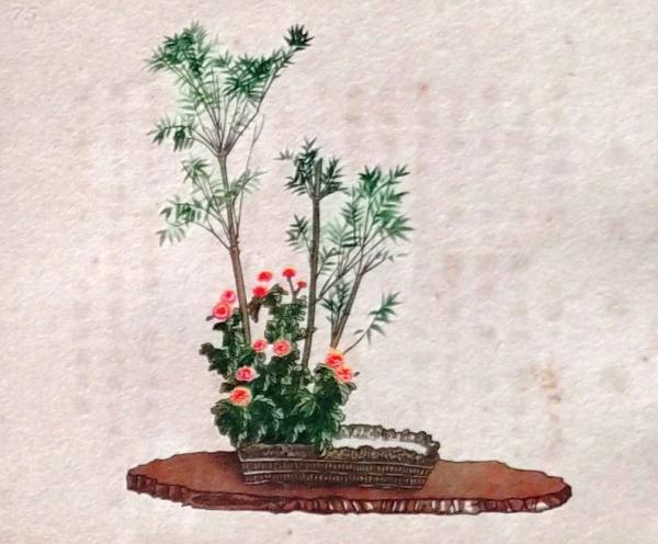 D26030657〇彩色石版画 老松に赤椿 笹 盛花 西洋花 生花図譜 華道 生花 解説付き 昭和年代〇和本古書古文書